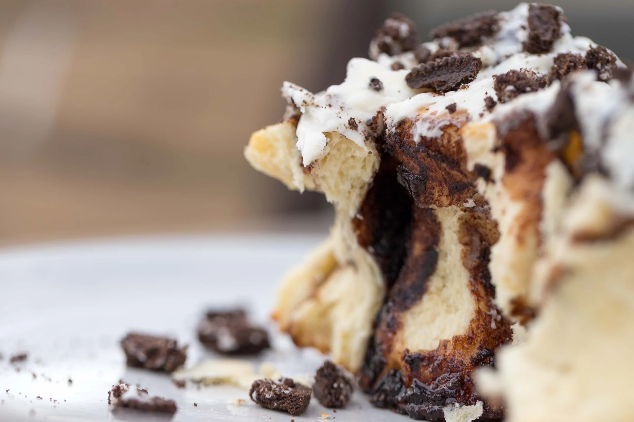 An Oreo cinnamon roll I made and photographed in 2025 (as part of my application materials The Great American Baking Show)